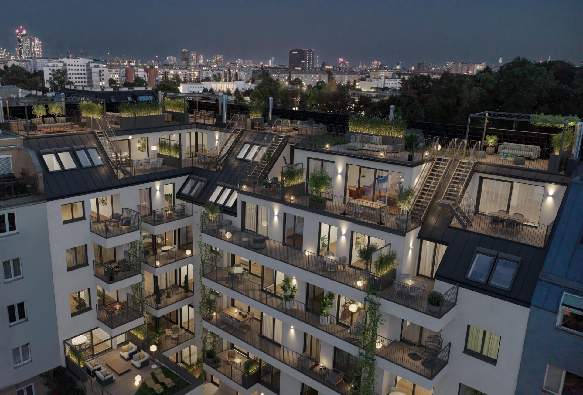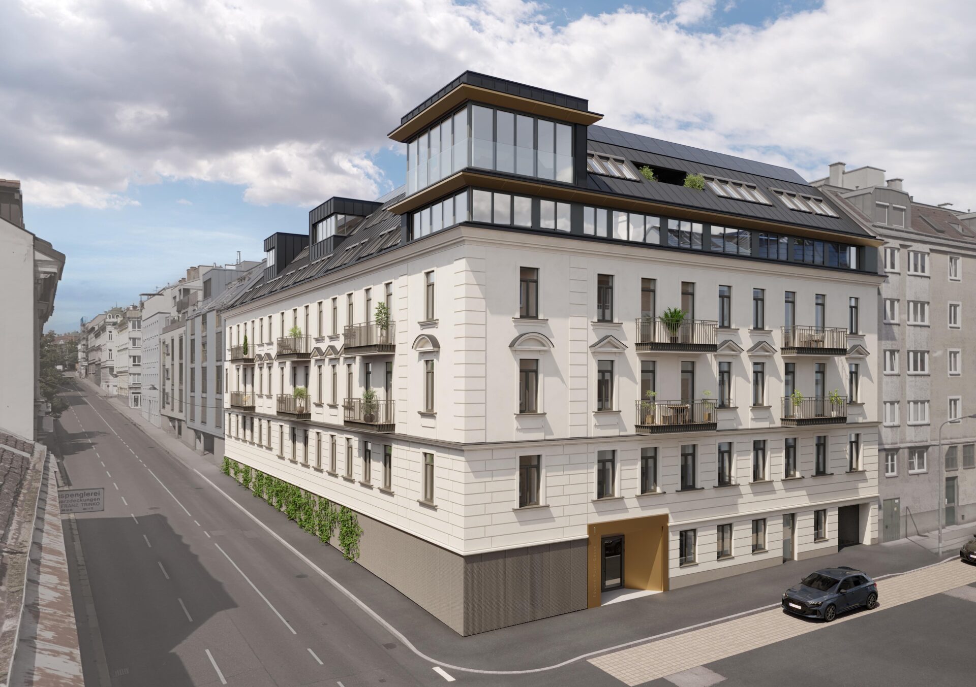 Zwei gründerzeitliche Häuser werden vereint! Die historische Fassade wird wiederhergestellt, das schmucklose kleinere Haus in die Gestaltung miteinbezogen. Zurückhaltende Balkone an der Straßenseite lockern die großen Flächen auf, der Dachgeschoßausbau erhält klare Linien mit wertigen Materialien. Die Geäudeecke wird hervorgehoben ohne den Gesamteindruck zu dominieren. Durch das prägnante Eingangsportal betritt man ein modernes Stiegenhaus. Die Hoffassade führt die klaren Linien fort und ist geprägt durch großzügige Freibereiche.